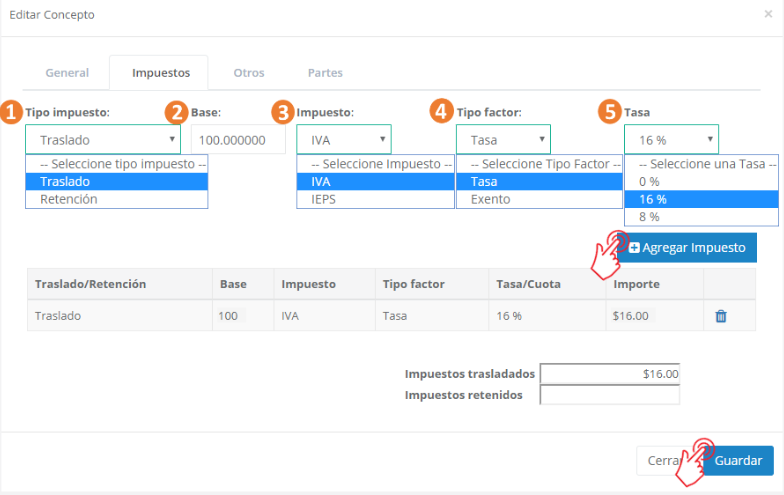 1. TipoImpuesto: Presiónalo para especificar que tipo de efecto aplicarás. Selecciona Traslado cuando requieres que el impuesto se sume al valor unitario del concepto y Retenido cuando el impuesto se descuenta o se resta al valor unitario.