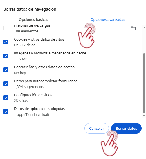 Archivos temporales de internet e imagenes en caché | Copias de páginas, imágenes y otro contenido multimedia almacenado en el equipo. El navegador usará estas copias para cargar el contenido con mayor rapidez la próxima vez que visites esos sitios. |