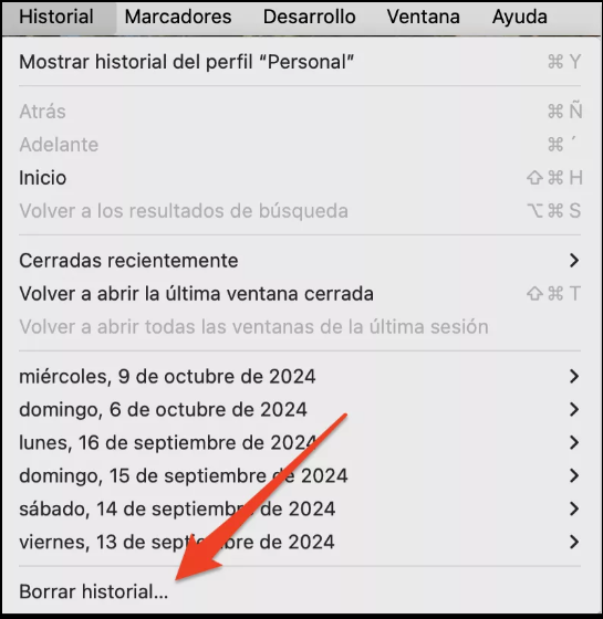 Es muy sencillo, seleccione de la barra superior la opción de Historial > Borrar historial, haga clic en el menú desplegable y a continuación seleccione hasta qué fecha anterior desea que se elimine su historial de navegación.