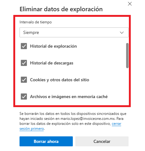 Posteriormente te mostrará una ventana en la que debes de seleccionar el intervalo de tiempo en el que sugerimos "siempre" o "todo" y seleccionar las casillas de cookies, historial, historial de imágenes en caché, una vez seleccionado de clic en Borrar ahora
