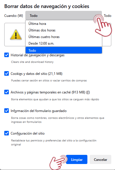 Haz clic en el menú desplegable que se encuentra al lado de Cuando para limpiar para elegir qué quieres limpiar de tu historial de Firefox y selecciona los marcadores junto a las opciones que quieras borrar o eliminar de tu historial de navegación.
