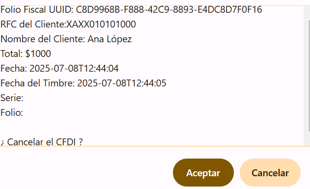 Una vez dando clic en el la "X" mostrara un mensaje de alerta y damos clic en Aceptar. | Una vez presionado este botón se mostrará una ventana que solicitará indiques el motivo de la cancelación: | |