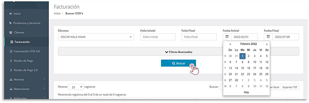 2. Filtra los datos del CFDI a cancelar: nombre, fechas, etc...
