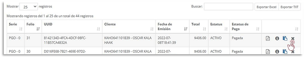 3. Solicita la cancelación del comprobante, dando clic en el icono a la derecha