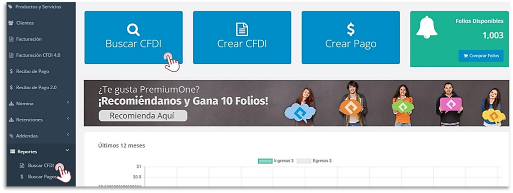 1. Buscar CFDI. Desde el panel principal “Inicio” ingresa a Buscar CFDI, o bien desde el menú lateral izquierdo ingresa a “Reportes” y a la sección Buscar CFDI.
