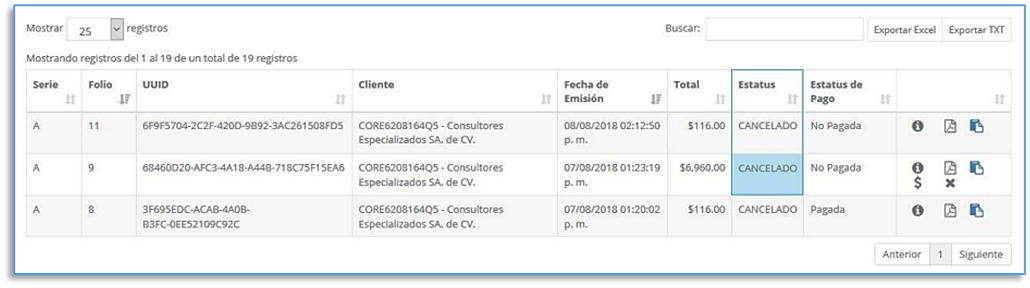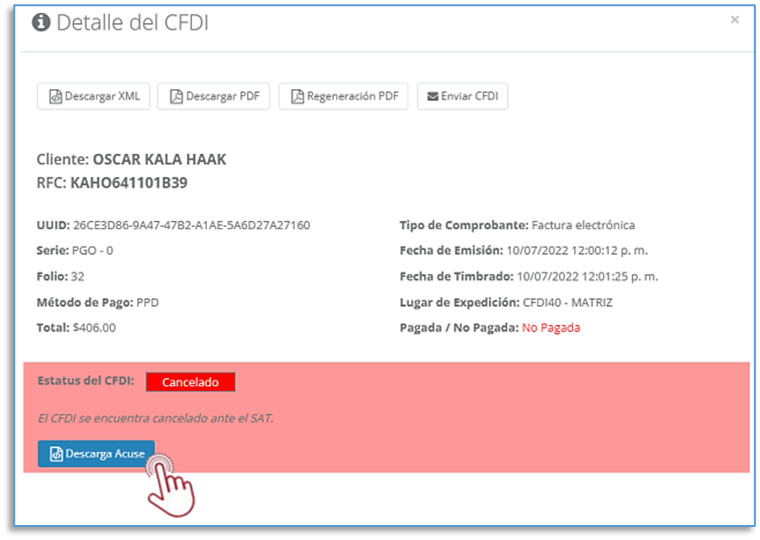 En la consulta de detalles de tu factura podrás visualizar la leyenda de “Cancelado” en la parte superior derecha y obtener el acuse de cancelación como respuesta.