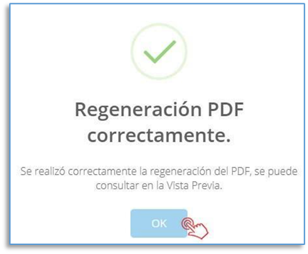 El proceso concluirá con el mensaje de la regeneración correcta del PDF, confirma en el botón OK para consultar tu factura.