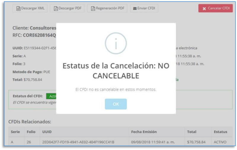 Indica que el CFDI no puede procesarse para la cancelación, da clic en OK y verifica las opciones en la tabla.