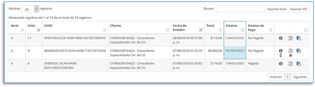 Al cerrar la ventana de Detalle de CFDI, podrás encontrar que el estatus ha cambiado de Activo a En Proceso, de manera que puedas verificar los CFDI que están bajo un proceso pendiente.