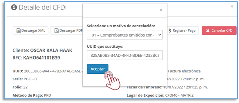 En este caso, si ya existe el CFDI de reemplazo considera el UUID/folio fiscal y lo colocas en el campo de sustitución: XXXXX-XXX-XXX-XXX donde darás clic en Aceptar para confirmar y esperar el resultado de tu solicitud.