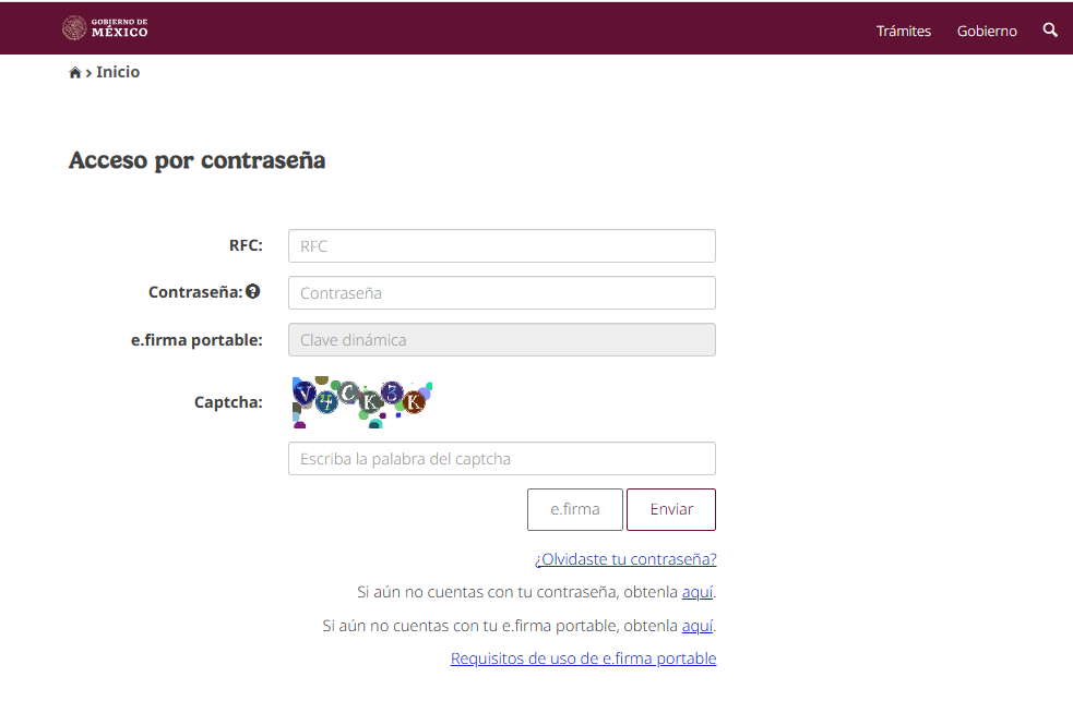 5.- Debes de ingresar con tu contraseña o con tu e.firma
