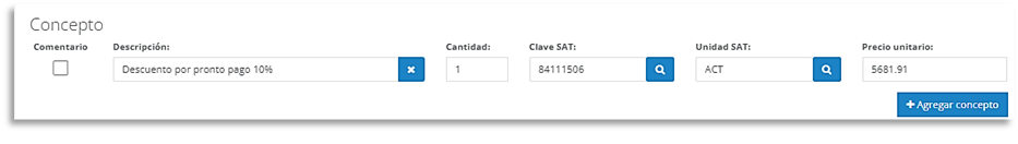 por motivo de descuento indica la descripción, cantidad y conserva para las claves SAT 84111506 (Servicios de facturación) con ACT (Actividad) y determina el valor unitario como cuota antes de