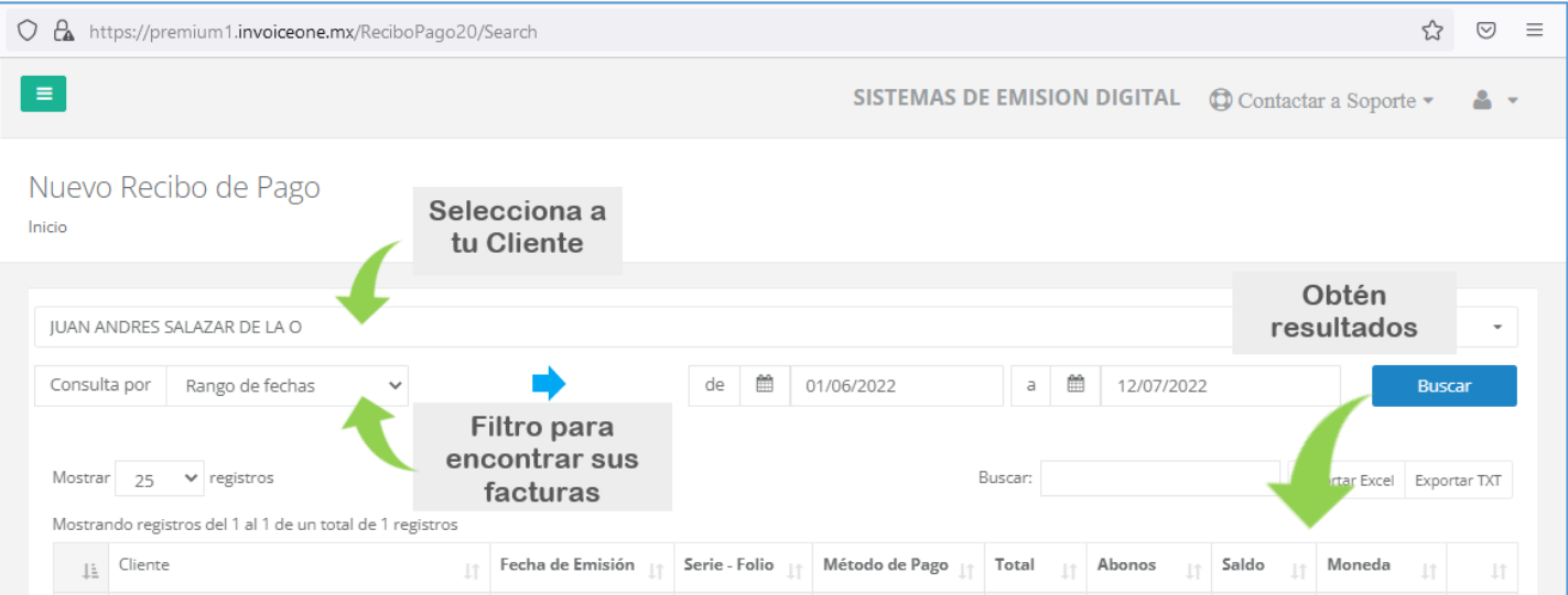 Selecciona al cliente a quien emitió el CFDI, elije una opción para consultar por rango de fechas o periodos