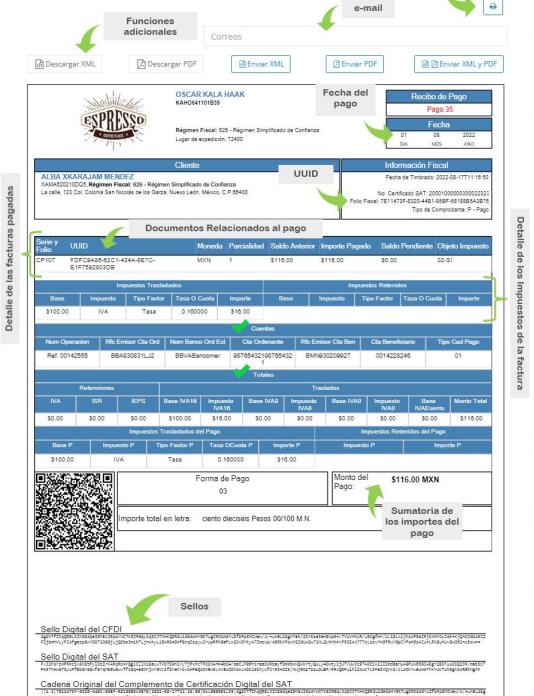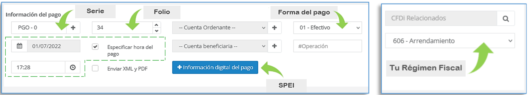 Aquí indicas los datos del pago recibido como: fecha y hora del pago, forma del pago , cuentas, número de