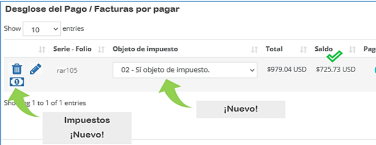 Aquí se determinan la(s) factura(s) vinculadas al recibo de pago. Y requiere de nuevos campos para el complemento de pago, la clave de objeto de impuesto y revisión del desglose de los impuestos que se hayan incluido