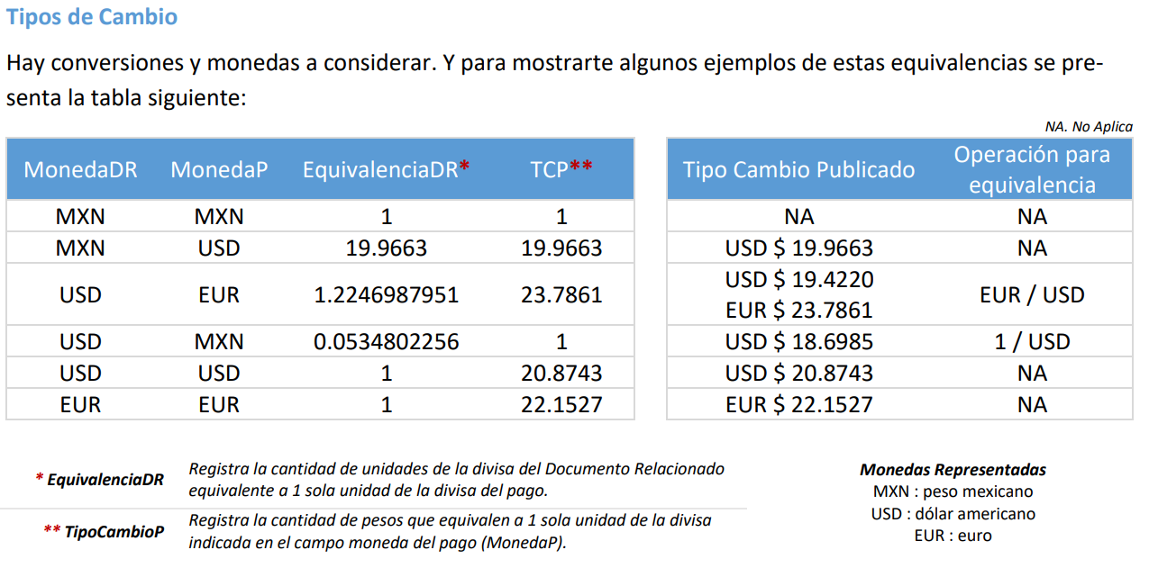 cuando hay monedas distintas entre el pago y los documentos relacionados, por la conversión monetaria.