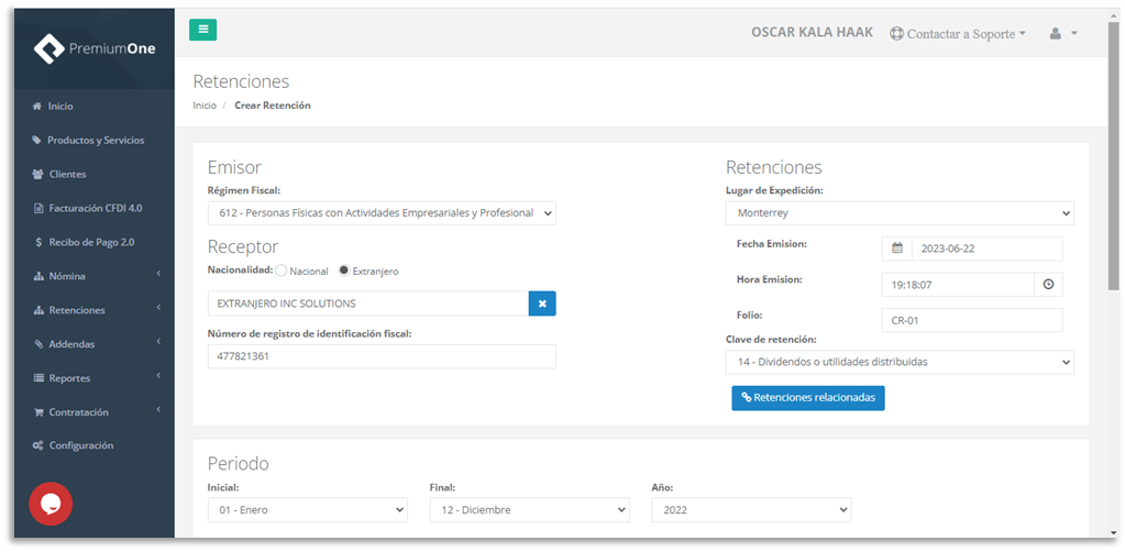 cliente (el, receptor), incluyendo datos de la retención como: lugar de