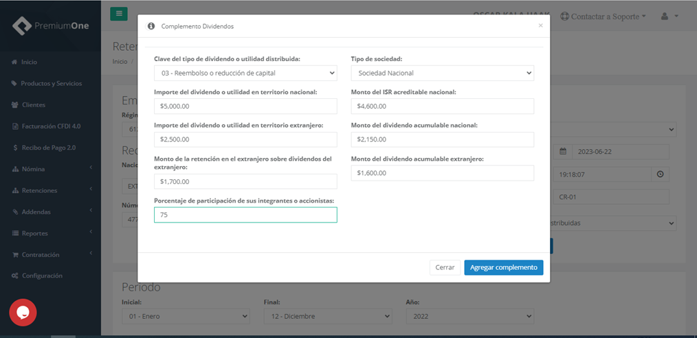 (inicial-final), impuestos retenidos llenando los datos de pago, base y monto