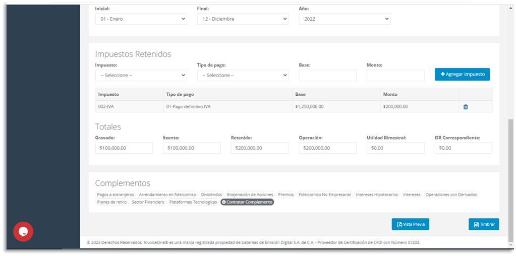 Obtendrás la siguiente ventana, misma que complementarás con la información que requieres para el impuesto que manejarás en esta emisión: