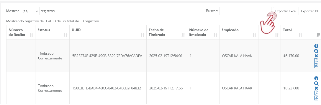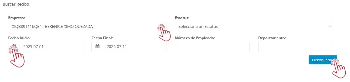 Presiona el botón Buscar para localizar los recibos de nómina que necesitas en tu reporte.