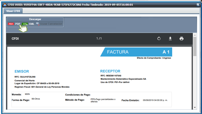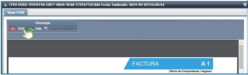Así mismo, desde esta misma ventana podrás procesar la descarga del PDF y XML de tu comprobante, localiza en la esquina superior a su izquierda los botones de descarga: