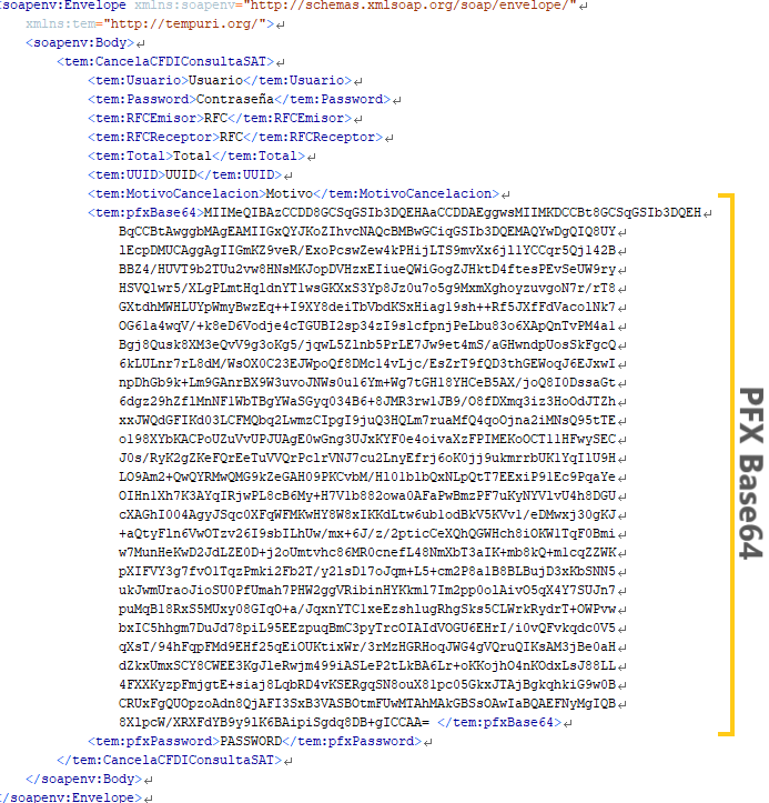 Durante el armado de la petición de cancelación se requiere del PFX transformado en cadena base64 para procesar efectivamente la solicitud, si bien, es requerido en el llamado al Web Service, esta es una cadena que el sistema propio del usuario debe ser capaz de crear e integrar a la peticiónSOAP y queda fuera de nuestro alcance.