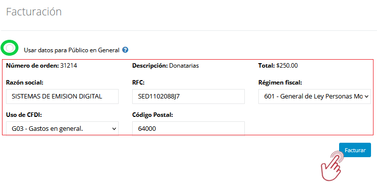 1.2.- Si cuentas con la factura pendiente te mostrará el botón en azul para facturar, da clic en el y te mostrará la opción para facturar a publico en general o bien con tus datos fiscales