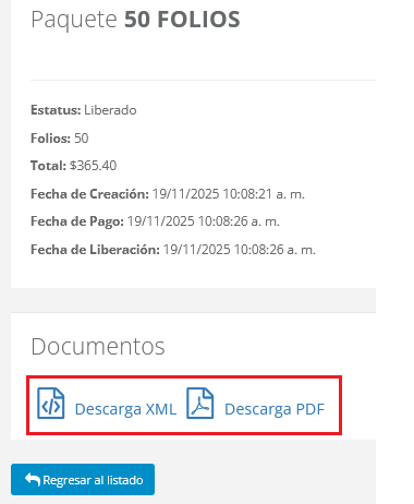 que se encuentra de lado derecho de la compra reciente. - Te mostrará la información de la compra y al final los botones de descarga de XML y PDF, al dar clic en alguno de ellos te permitirá la descarga.