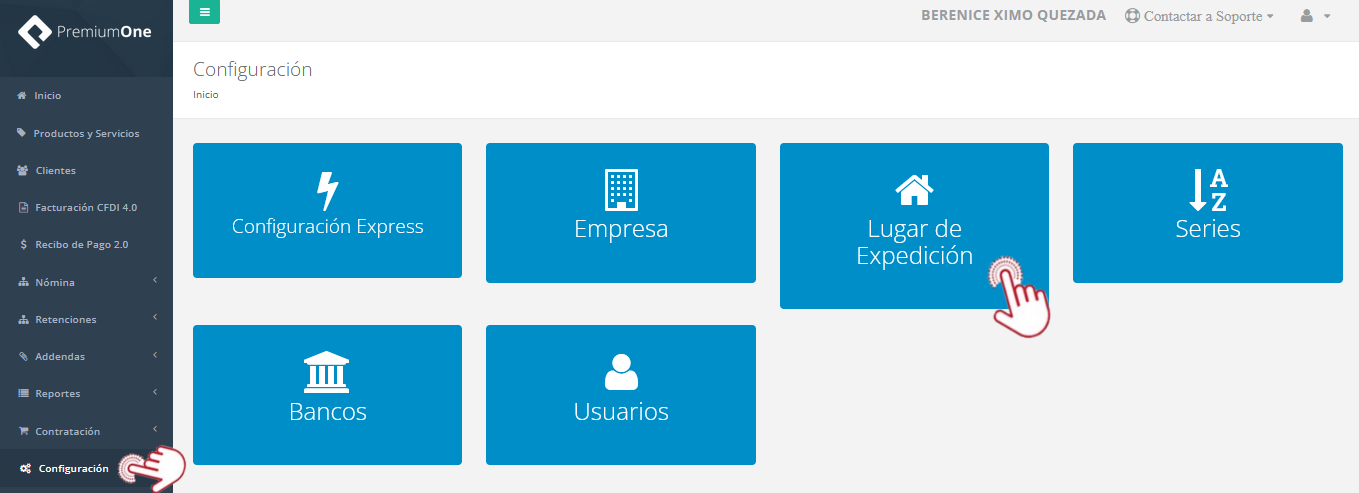 Desde el panel principal de PremiumOne, ingresa al menú Configuración que se encuentra en el menú lateral izquierdo. Y de la página que obtienes selecciona el catálogo Lugar de Expedición.