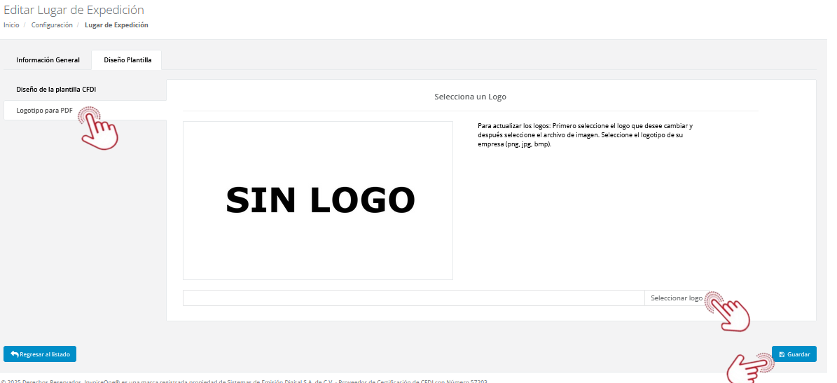 Verás en pantalla la siguiente ventana, localiza la pestaña Logotipo para PDF. Desde ahí podrás instalar la imagen de tu logotipo. Presiona el botón Seleccionar Logo para abrir las carpetas de tu equipo y seleccionar la imagen que requieras.