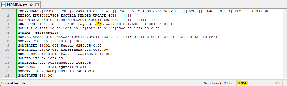 Ejemplo identificación de un txt sin UTF-8 en un recibo de nómina: