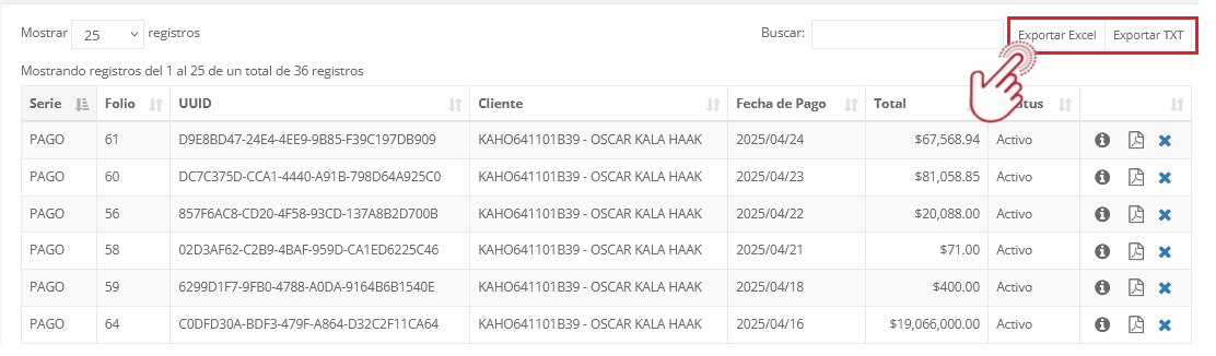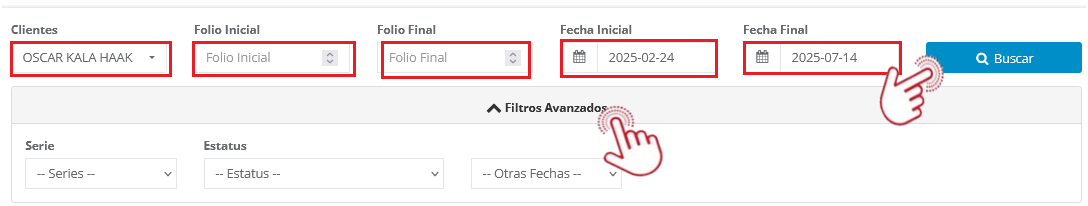 Así mismo, cuentas con filtros de búsqueda avanzados para hacer el resultado mas específico. Presiona el botón Buscar para obtener un listado con los recibos que necesitas en tu reporte.