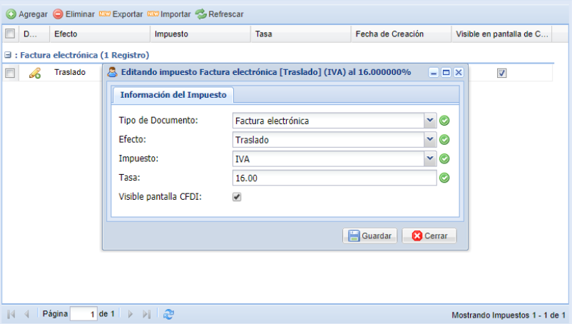 Efecto Seleccionan Traslado o Retención para indicar que la tasa de impuesto al total del producto o servicio o factura. | Tasa Ingresa manualmente la tasa correspondiente a este impuesto, para un ejemplo para un 16% de IVA coloca solamente 16 sin signo por porcentaje ó 10.66 en un ejemplo de tasa con decimales. |